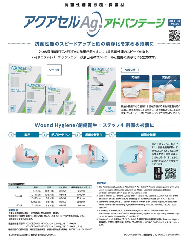 2つの添加剤、BTC(塩化ベンゼト二ウム)とEDTA(金属キレート剤)の作用により、銀イオンによる抗菌性能のスピードを向上しました。 滲出液、細菌などをドレッシング内にトラップし、ドレッシング交換のたびに創面の清浄化を促進します。 吸収力1.5倍※、ハイドロファイバー2枚重ね構造 強度9倍※、ゲルが破断しにくく剥がしやすい 創傷に密着、湿潤環境を形成し自然治癒力を促進 ※アクアセルAgとの比較 |